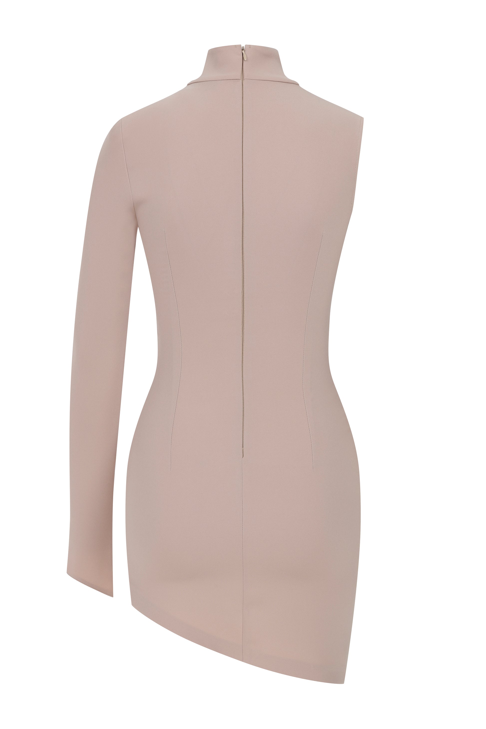 One shoulder sandy beige asymmetric mini dress with nude-tan tulle.