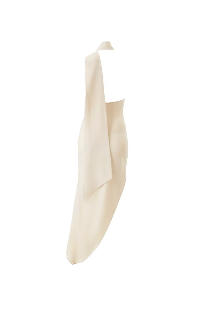 LIGHT IVORY-CREAM DRESS COMPLETED WITH A LONG SASH TIED AROUND NECK.