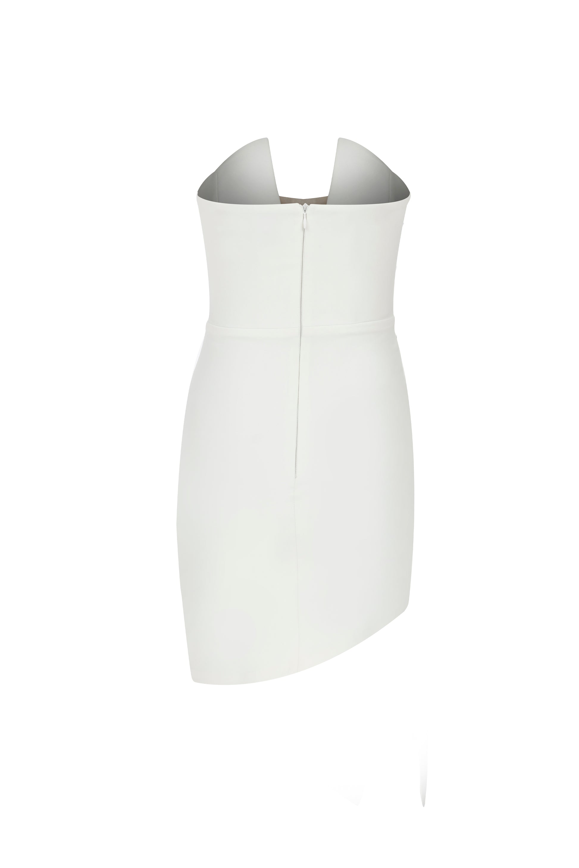 Asymmetric white mini strapless dress with nude-tan tulle.