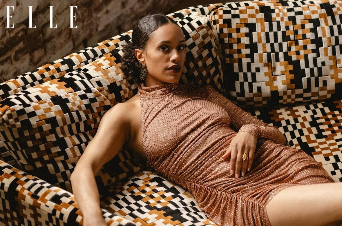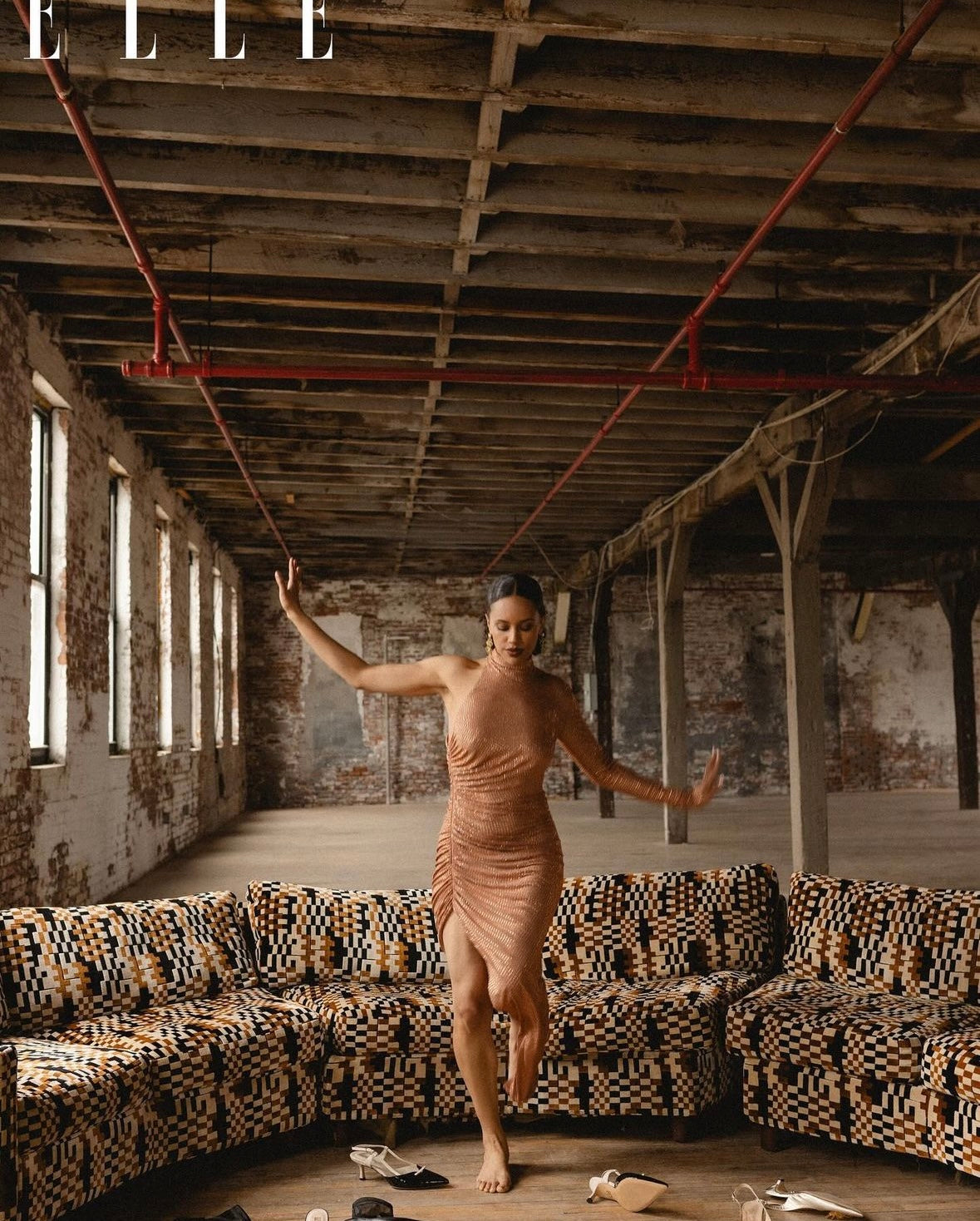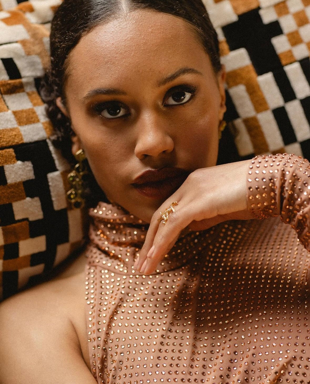Brown-bronze one shoulder slit dress with small bronze sparkling stones.
